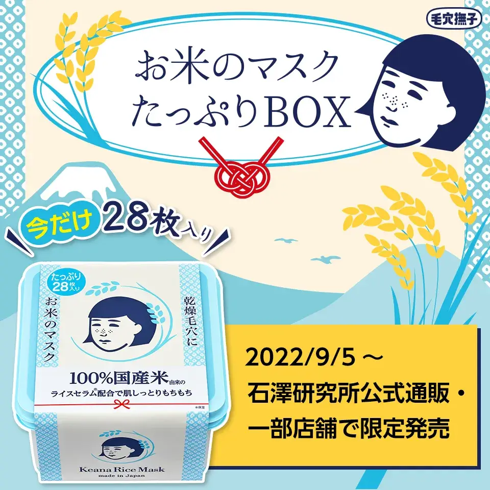 This is a “rice mask” containing 100% domestic(Made-in-Japan) rice-derived ingredients for more moisturizing pore care. A thick sheet mask containing plenty of beauty essence adheres tightly to the skin. Makes the texture plump and leads to firm skin.